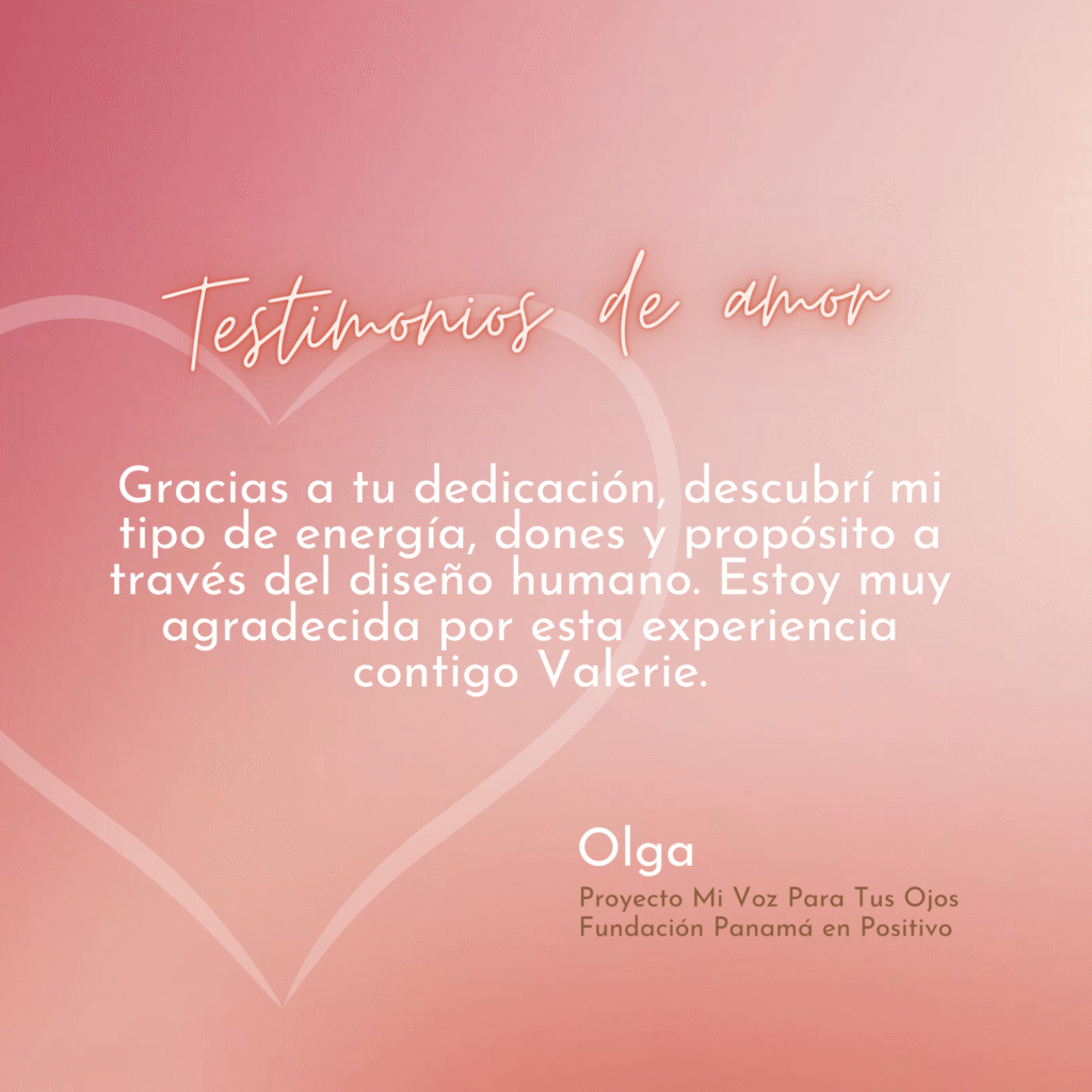 Quiero que sepas mi experiencia cuando me hiciste conocer el diseño humano y también agradecerte por tu tiempo dedicación a pesar que nos encontremos en esta circunstancias para mí el diseño humano me pareció genial porque descubrí o me enseñaste a conocer mi tipo de energía mi información personal, estrategias, canales, puertas y sobre todo mis dones cree me que ha sido de gran valor esta experiencia junto a ti mi queridísima Valerie quiero que sepas que me siento agradecida primero con Dios por permitir esta conexión con nosotras y sobre todo como me ayudara el diseño humano a mi vida como poder tomar decisiones correctas y poder aceptarme tal cual como soy, con mi relaciones familiares y amistades también me enseñaste cual eran mis dones mis habilidades y mi propósito en esta vida deberás Valerie gracias por ser parte de nuestra historias te quiero muchísimo.»