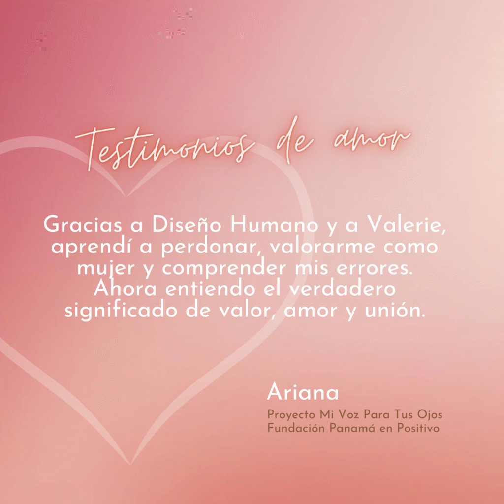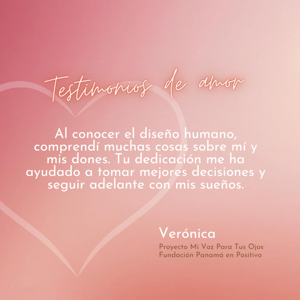 «Soy Verónica quiero contarte Valerie que al conocer diseño humano para mí fue muy espectacular porque comprendí muchas cosas sobre mí y créeme que la experiencia que tuve con usted al momento de compartir mis palabras sobre mi vida y saber que nada está perdido si no que solo me queda continuar con lo que he soñado gracias a ti por tu dedicación hacia a mí y no solo yo también hacia mis compañeras todo esto me ayuda a ser más fuerte y ágil  para tomar decisiones correctas en mi vida me enseñaste cuales eran mis dones y habilidades y mis propósitos es servir a mi gente hermosas gracias a Dios y a ti Valerie por ser y por formar parte de nuestra historia te quiero mucho mucho y mil gracias «